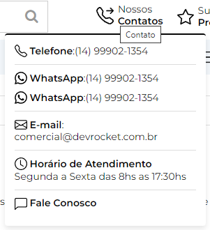 O tema também permite a inserção de informações como Telefone, WhatsApp, E-mail e horário de atendimento diretamente no cabeçalho.