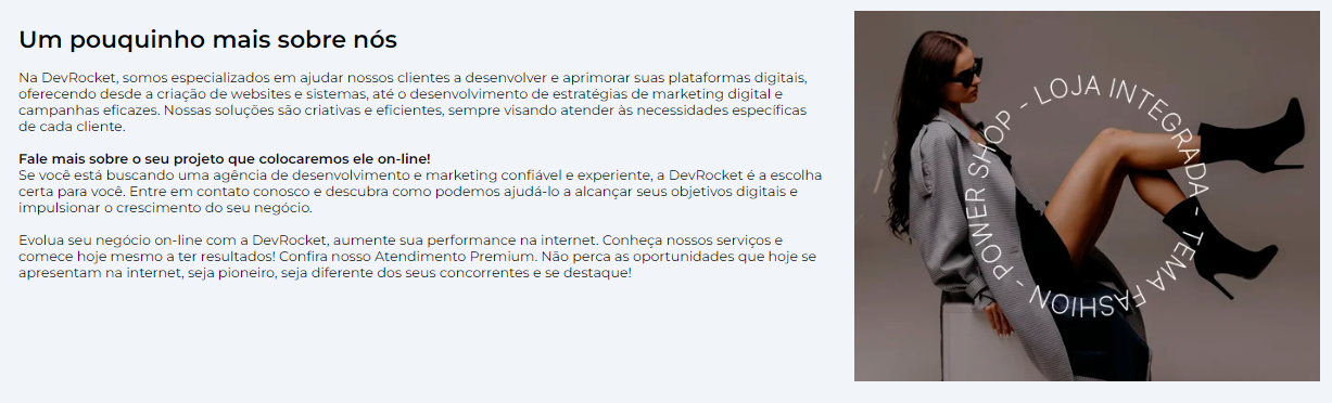 A DevRocket é uma empresa de tecnologia focada no desenvolvimento de soluções para a internet, com expertise em estratégias de marketing e especialização em e-commerce. Alcançando uma audiência de mais de 25 milhões de pessoas mensalmente, nosso principal objetivo é transformar o seu projeto em uma presença sólida online.